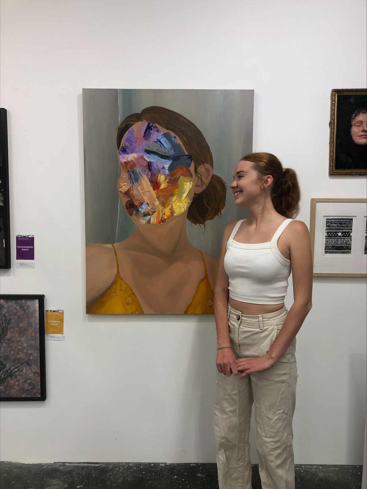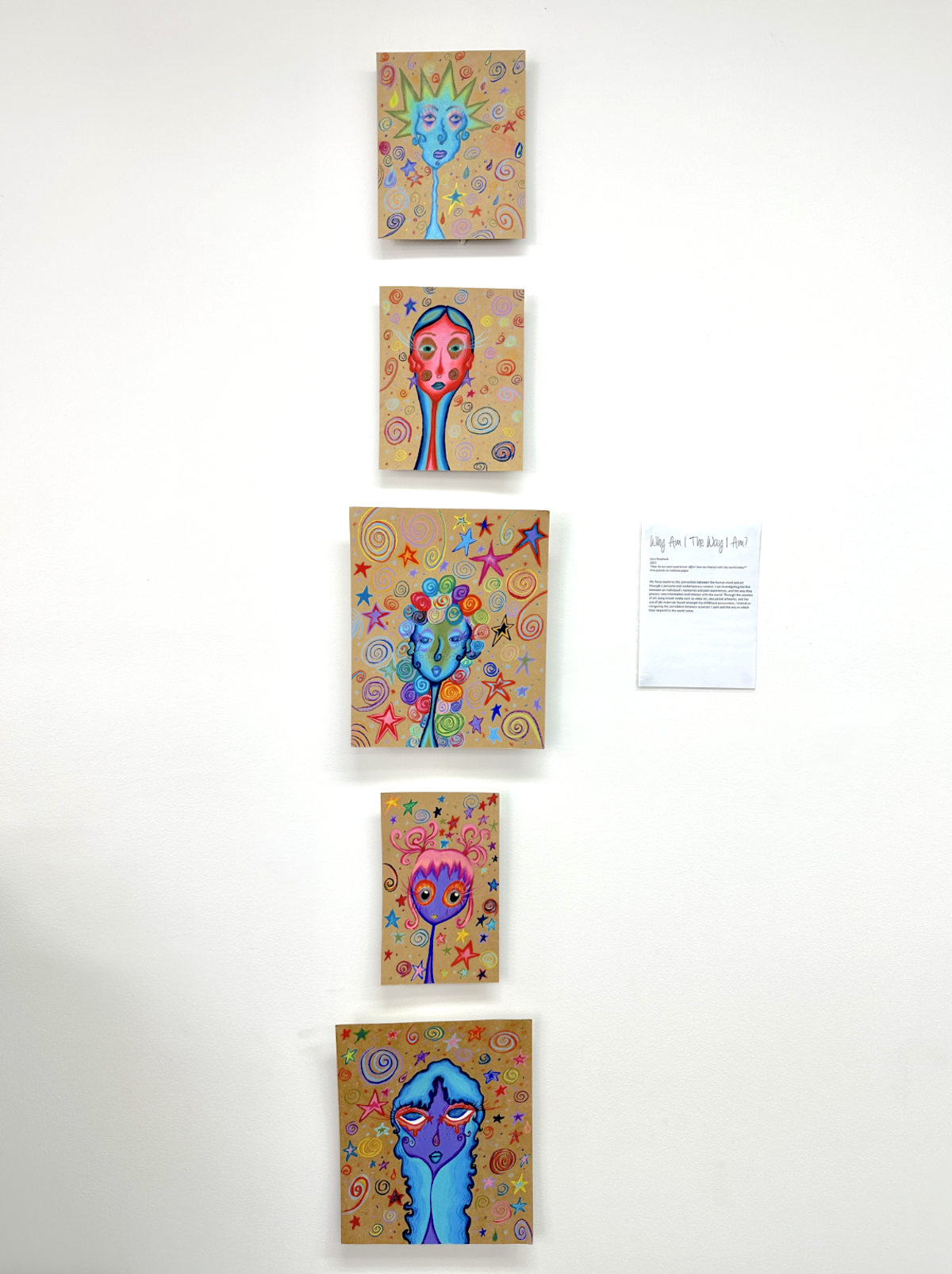 Artist's Statement: The art of self-acceptance is dependent on the ability to recognise abnormality. Concealing insecurities and covering ‘flaws’ is common among those who lack an inner stillness. So often we compare our own traits and behaviours to others’ only to realise that normal is the average of abnormality. Can “normal” ever be truly defined? ‘In Case I Don’t Like Me’ presents a contextually personal journey through masking behaviours deemed uncomfortable or abnormal. Exploration of the term ‘normal’ has led to recognition that insecurities are no less valuable than strengths. Inspired by the works of Joseph Lee and Stephanie Hogg, ‘In Case I Don’t Like Me’ combines the absence of self-acceptance and insecure masking through tantalising colours of acrylic and impasto medium to contrast the belief that “normal” can be defined. - Why am I the way I am? by Zara Shepherd