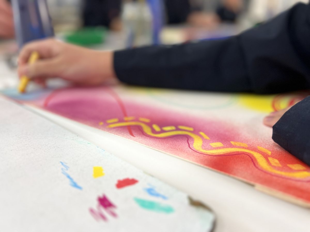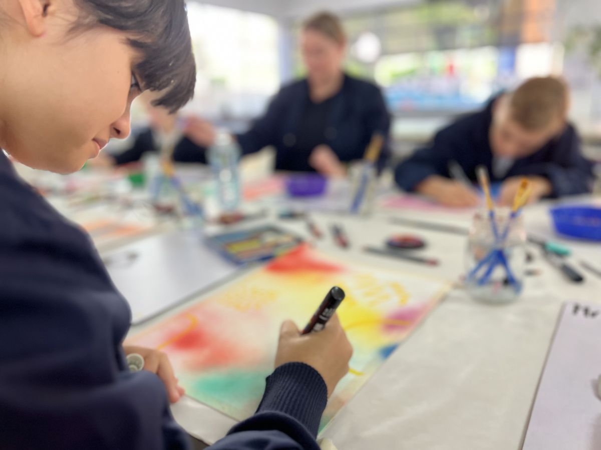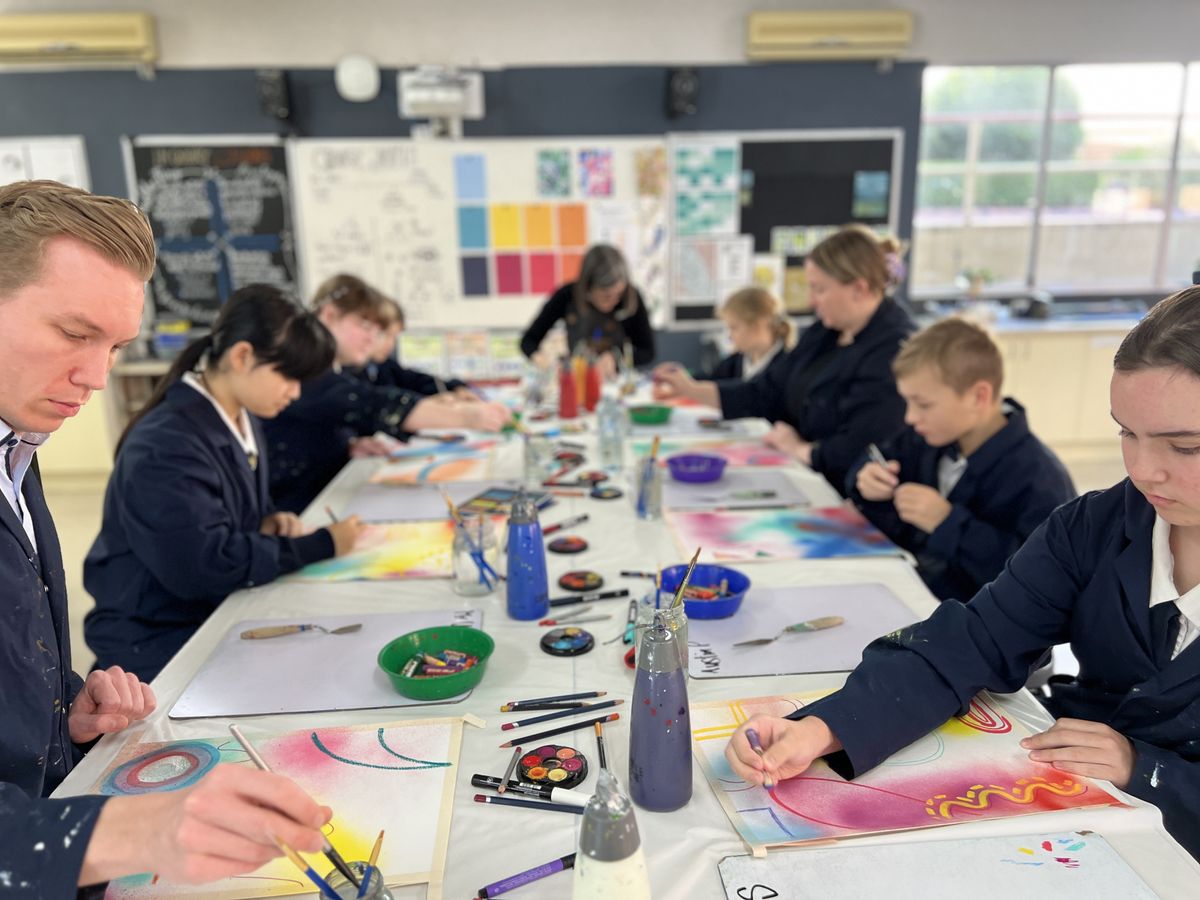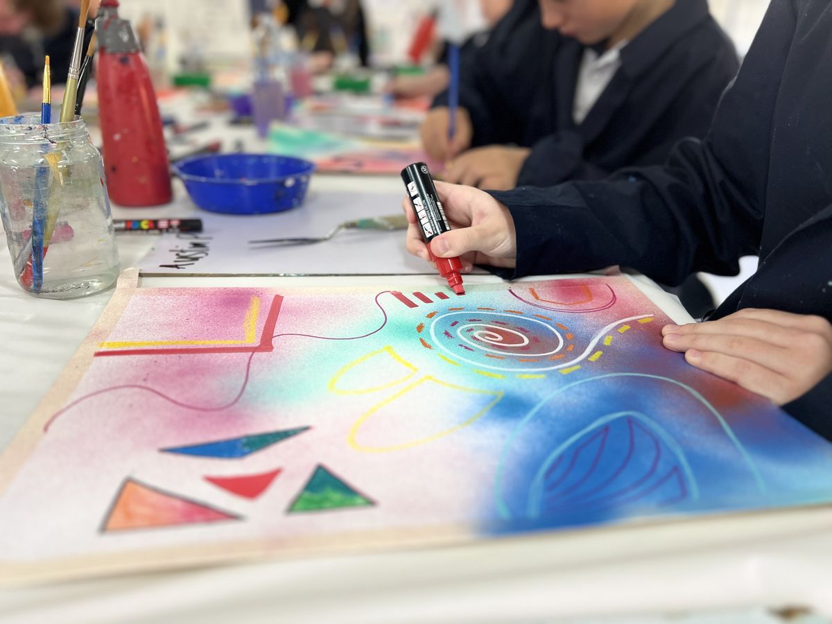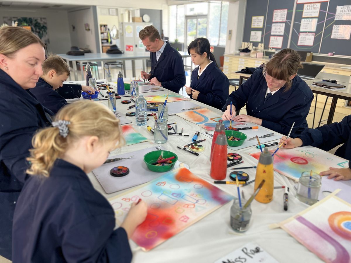 To maintain the collaborative flow, an alarm sounded every 15 minutes, signalling time to pass the artwork to the next contributor. The collaboration was expertly facilitated by Miss Rowe, the Visual Arts teacher, and carried out by Frankie R (Y2), Thomas J (Y3), Austin P (5B), Peh S (8B), Sienna S (9A), Sophie M (12A), Mr Usher, Mrs McCrostie, and Miss Rowe.