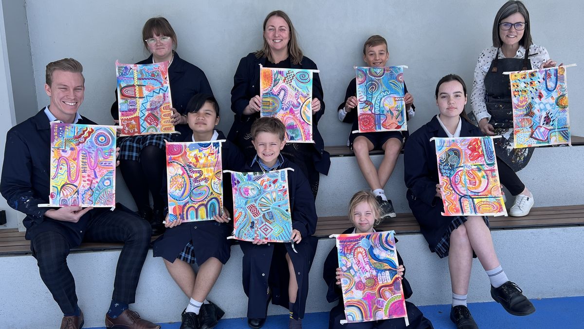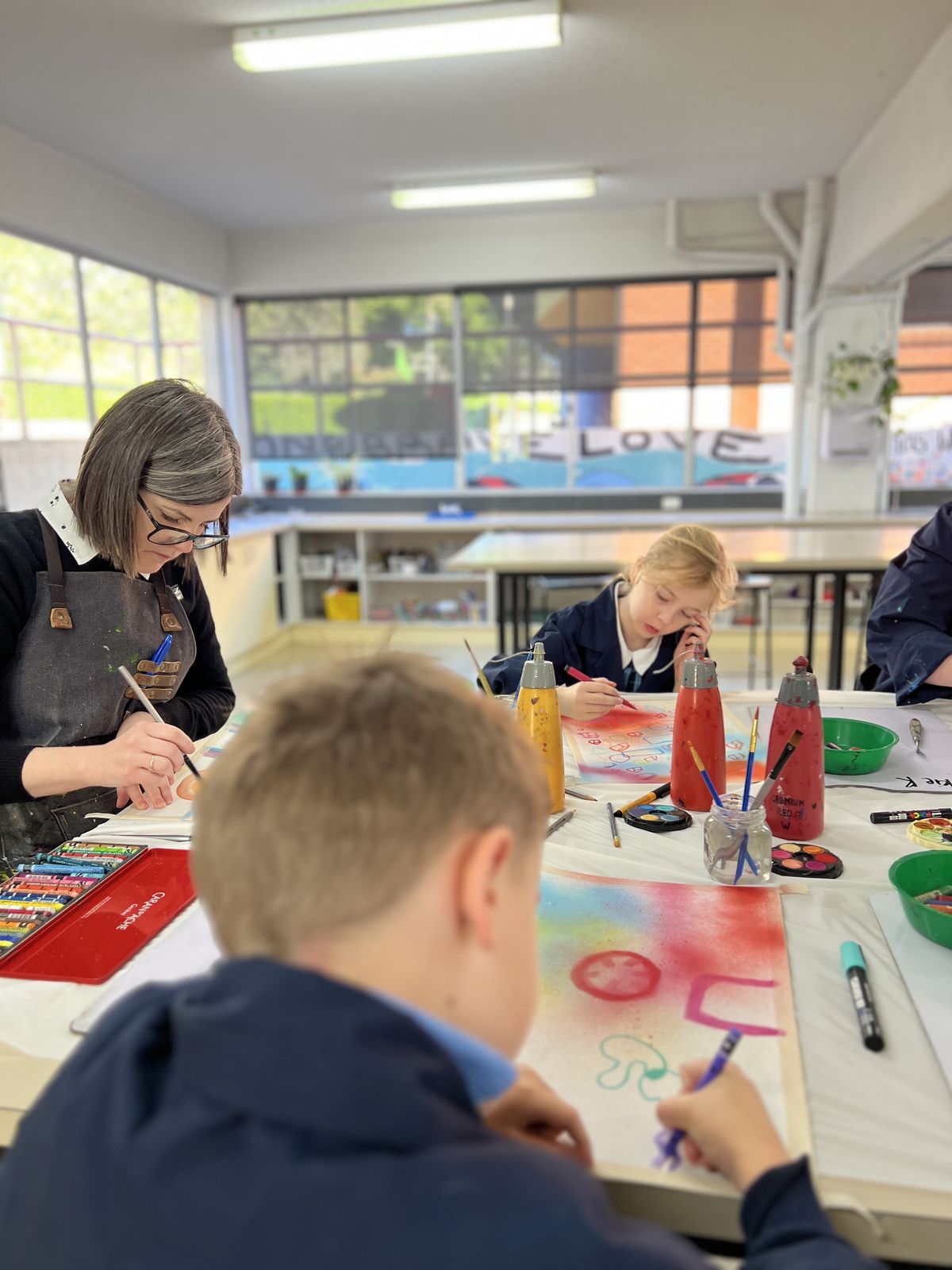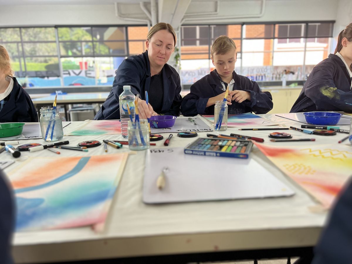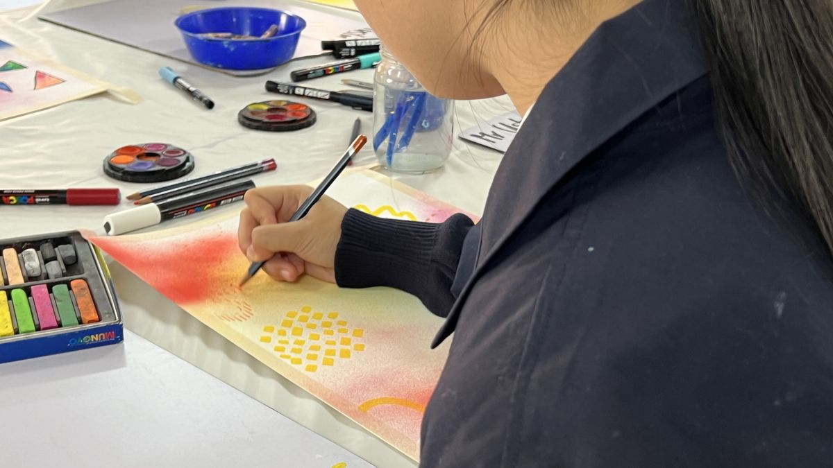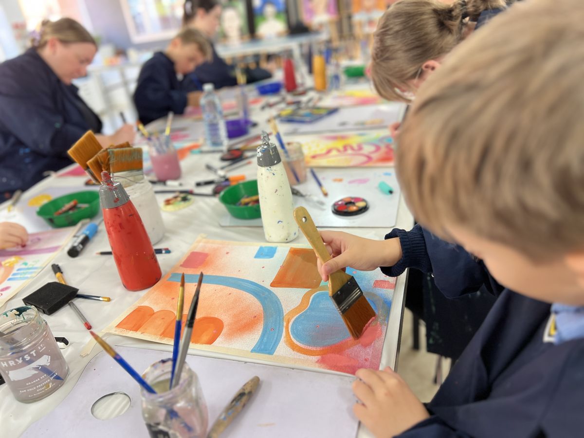 To maintain the collaborative flow, an alarm sounded every 15 minutes, signalling time to pass the artwork to the next contributor. The collaboration was expertly facilitated by Miss Rowe, the Visual Arts teacher, and carried out by Frankie R (Y2), Thomas J (Y3), Austin P (5B), Peh S (8B), Sienna S (9A), Sophie M (12A), Mr Usher, Mrs McCrostie, and Miss Rowe.