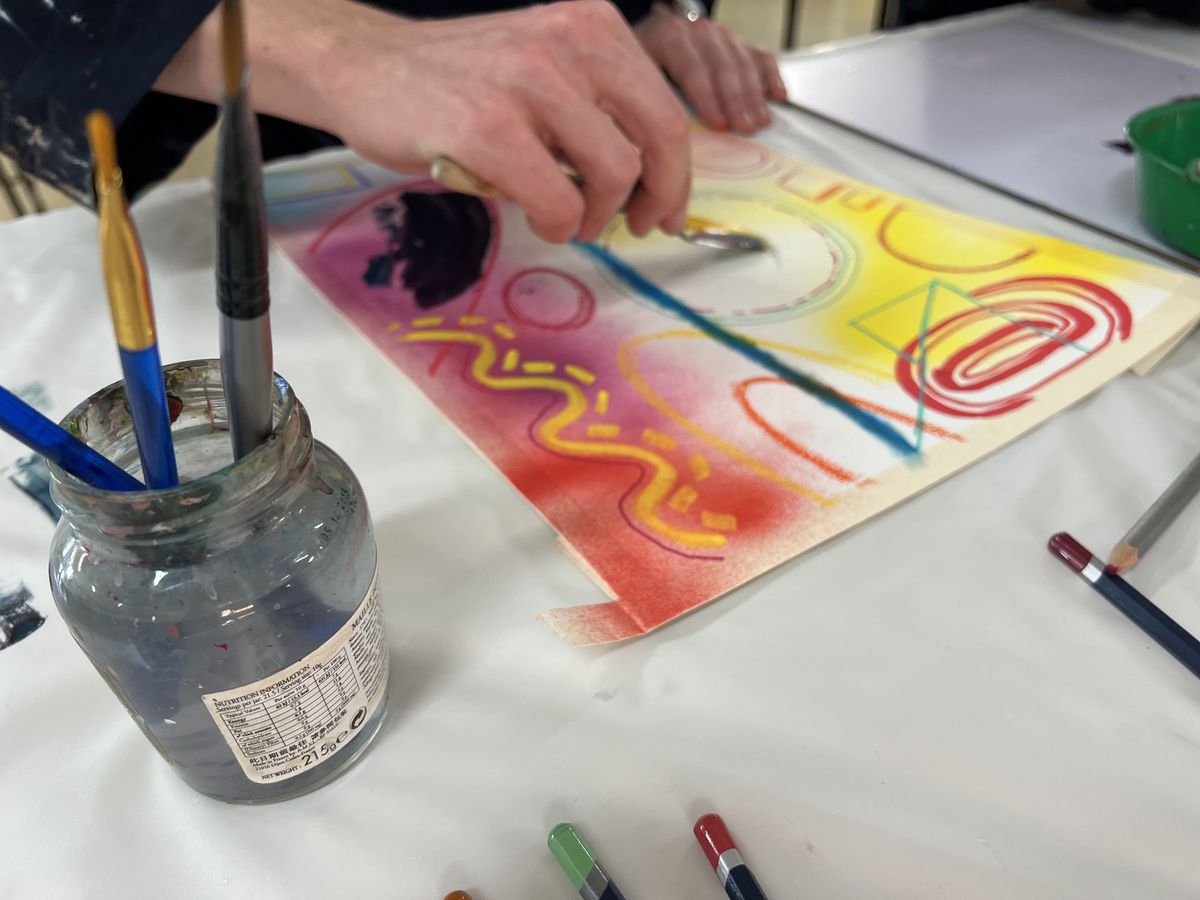 Perhaps the most challenging thing for most participants was simply getting started. Artist's block can hinder or even halt the creative process. Like writer’s block, it strikes when someone feels overwhelmed by the blank canvas before them, unsure of where to make the first mark or which colour and medium to use. Thankfully, Miss Rowe had already added spray-paint marks to each page, making the initial step a little easier. And so it was Frankie, the youngest of the group, who bravely picked up her chosen medium first, a pink crayon, and began making ovals and squares on the page.
