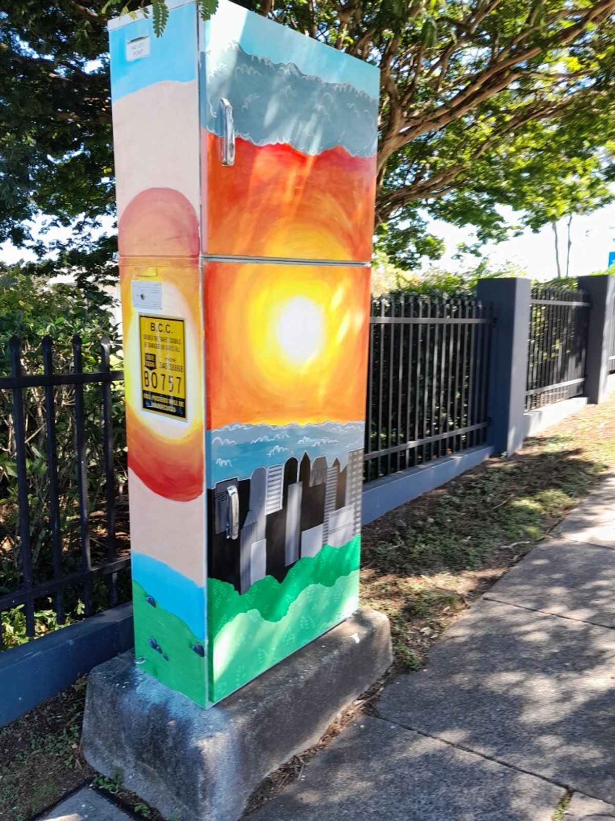 “Mountaintop Views” captures iconic elements of the Mt Gravatt and Mansfield area. On the front, Isabella painted the famous sunset view from the Mt Gravatt Lookout—a local scene tied closely to her own experiences and affection for the region. On one side, she depicts sunsets from another perspective, while the opposite side she features the winding track leading to the mountain’s summit.