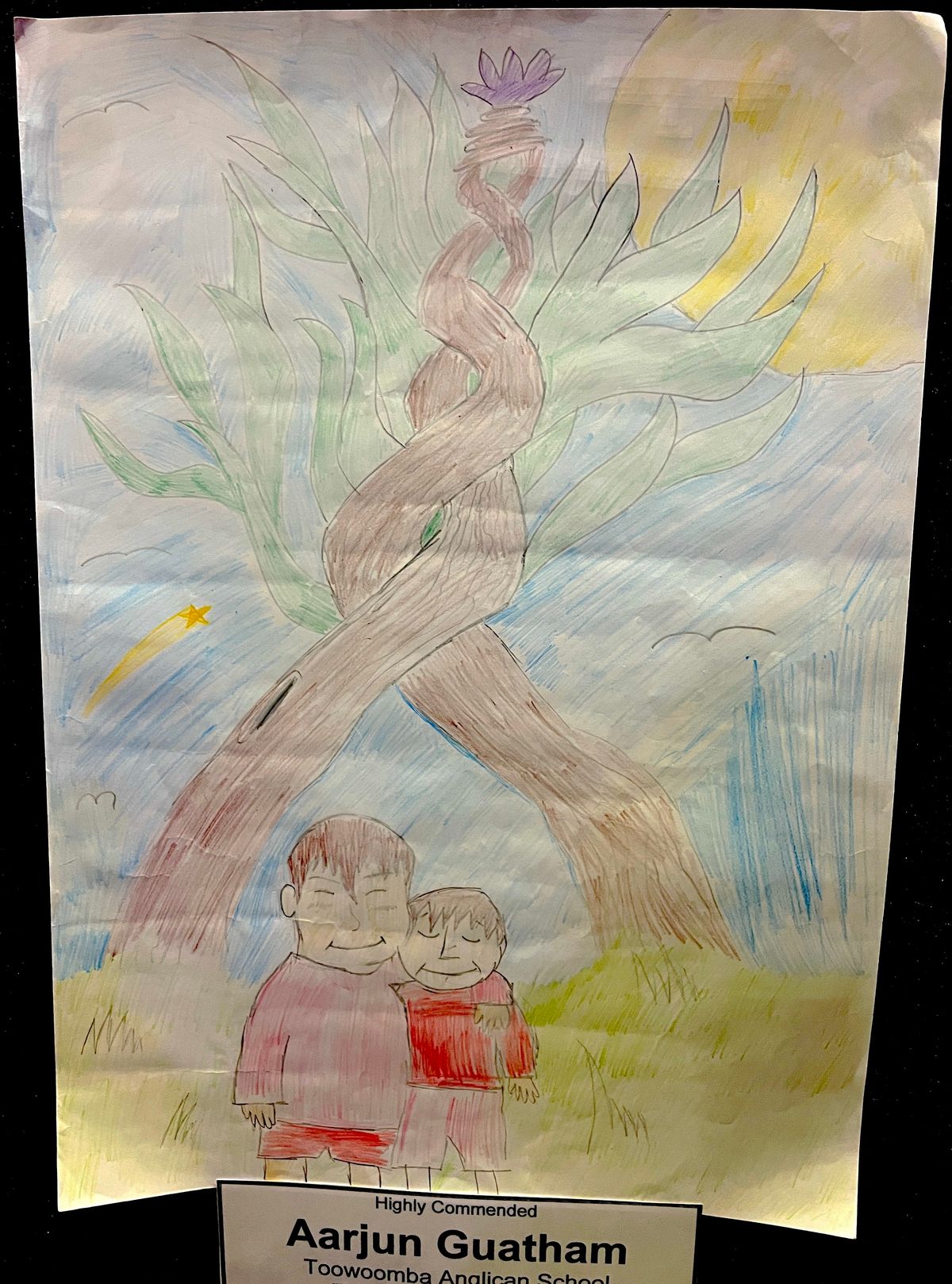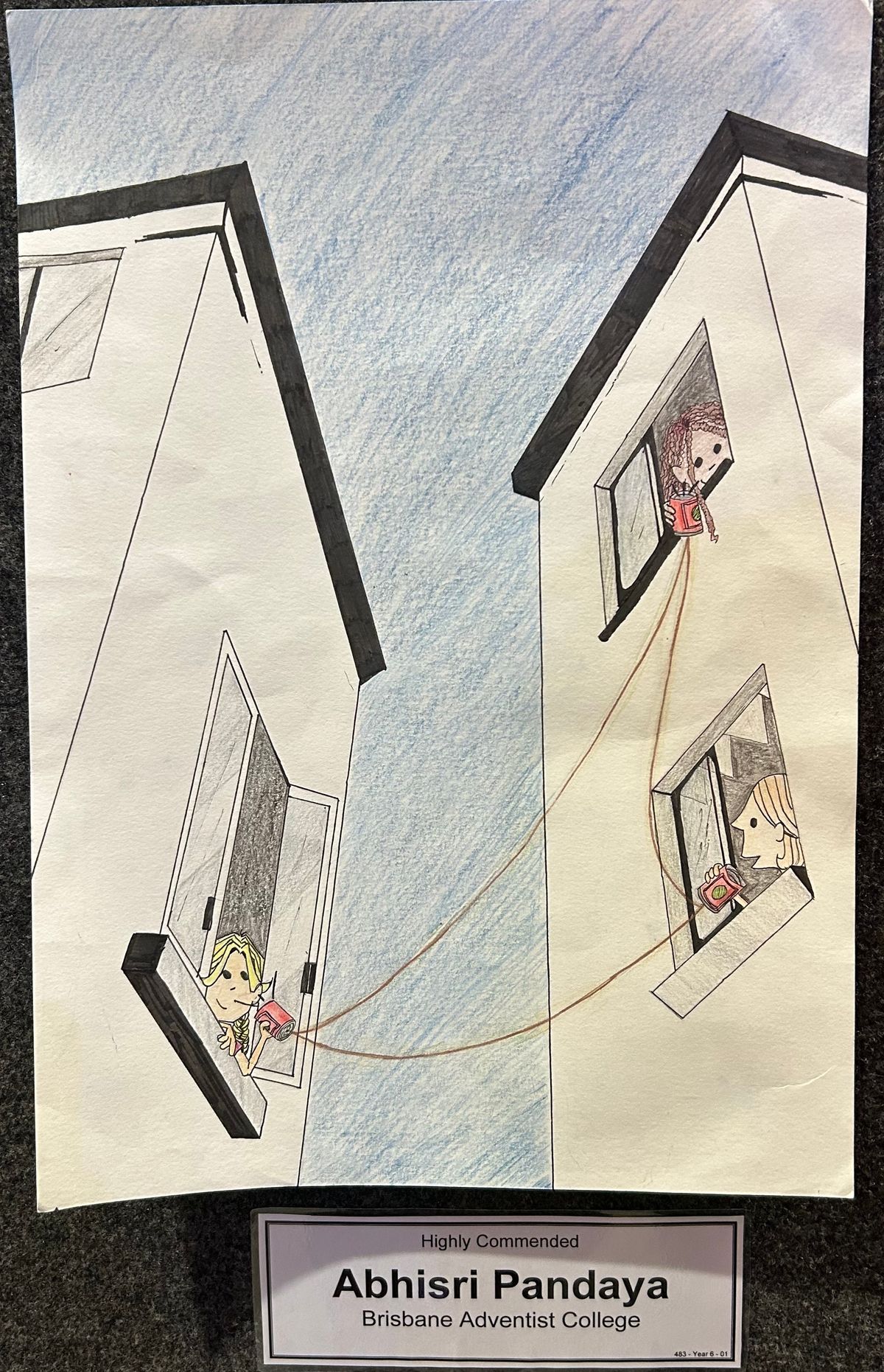 Featuring the exaggerated perspective of tall buildings rising to the sky, three friends use string and cans to talk with each other. Abhisri’s proud dad, Adrian, commented that “friends will always find a way to talk to each other despite physical or technical limitations!” Abhisri's use of basic drawing materials, clever concept, and simple message proved a winning choice.