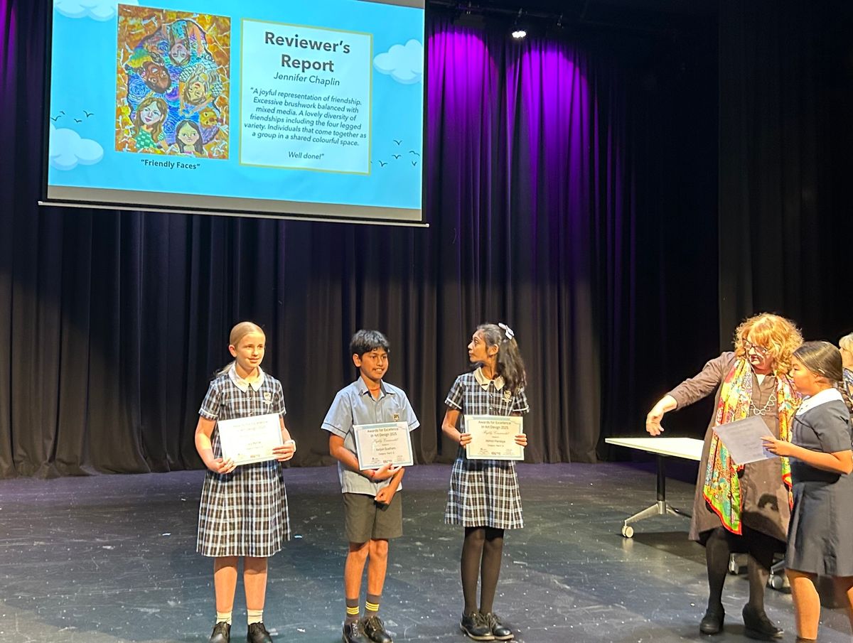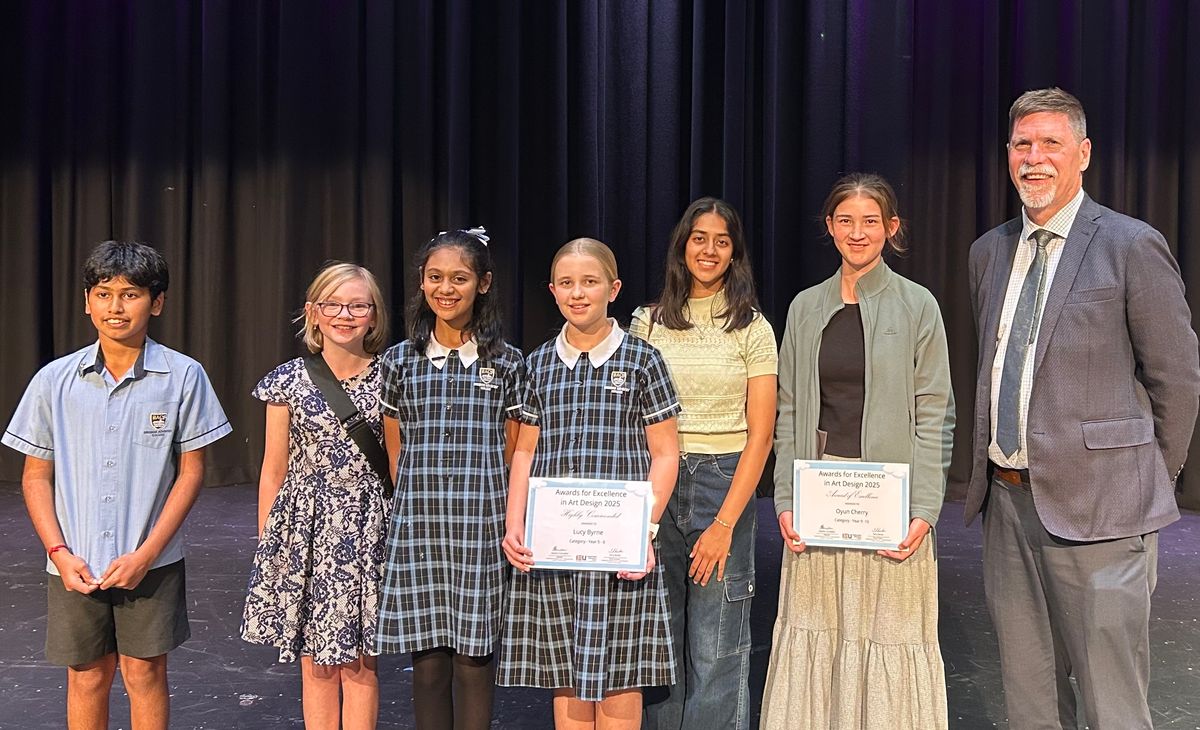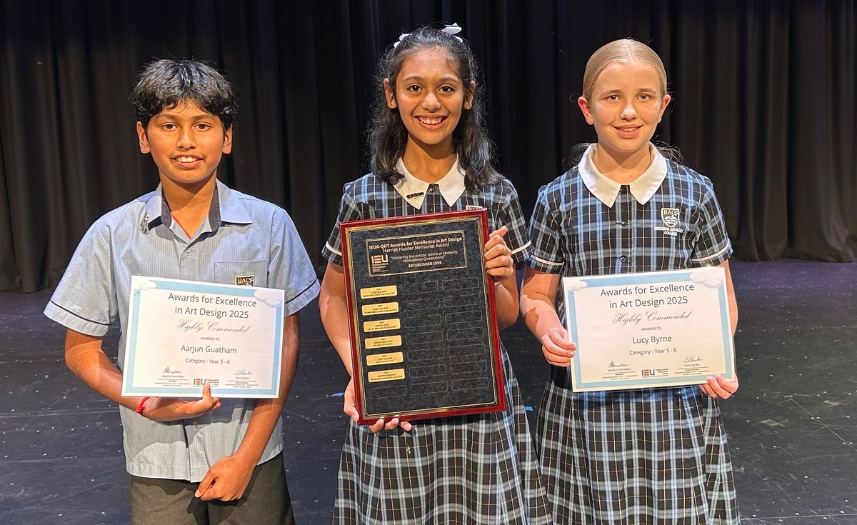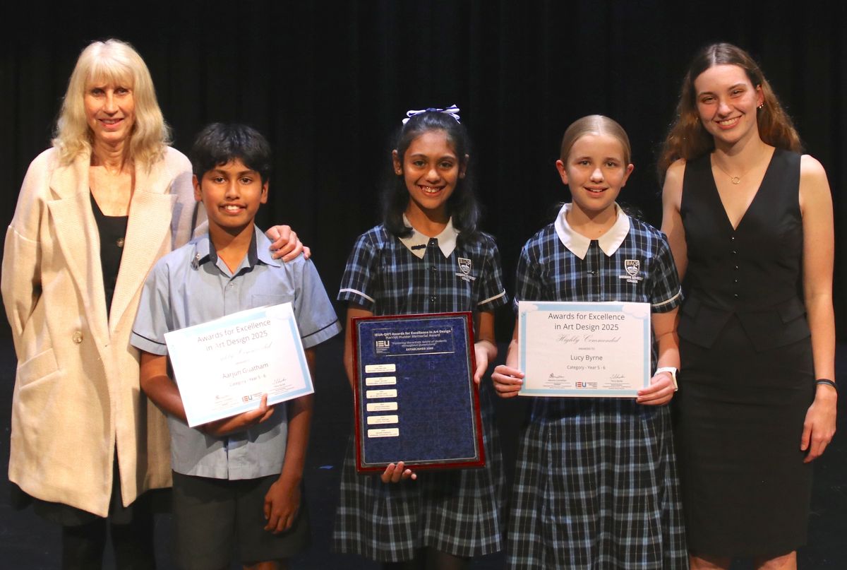 Our Year 6 students are buzzing with excitement after an incredible sweep of honours at the recent Independent Education Union’s (IEU) Awards for Excellence in Art Design for students from Queensland and the Northern Territory. Abhisri P, Aarjun G, and Lucy B each received High Commendations for their unique “Friends” artworks. And in a truly outstanding moment, Abhisri was awarded the prestigious Harriet Hunter Memorial Award—her artwork chosen as the best piece across all winning entries from Pre-school to Year 12!
